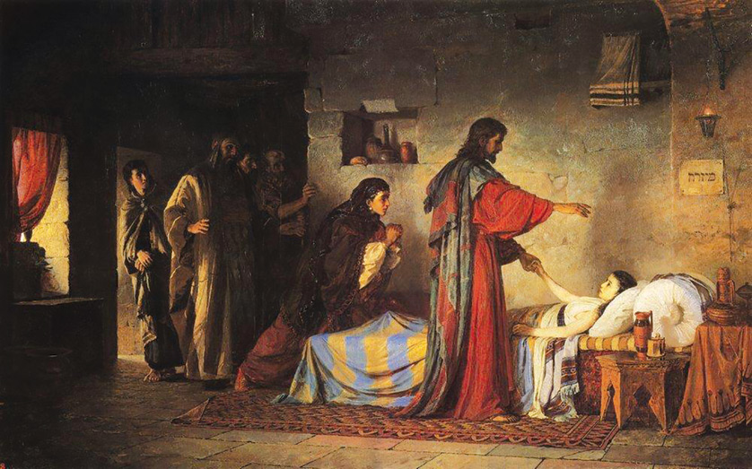 Naquele tempo, depois de Jesus ter atravessado de barco para a outra margem do lago, reuniu-se uma grande multidão à sua volta, e Ele deteve-se à beira-mar. Chegou então um dos chefes da sinagoga, chamado Jairo. Ao ver Jesus, caiu a seus pés e suplicou-Lhe com insistência: «A minha filha está a morrer. Vem impor-lhe as mãos, para que se salve e viva». Jesus foi com ele, seguido por grande multidão, que O apertava de todos os lados. Ora, certa mulher que tinha um fluxo de sangue havia doze anos, que sofrera muito nas mãos de vários médicos e gastara todos os seus bens, sem ter obtido qualquer resultado, antes piorava cada vez mais, tendo ouvido falar de Jesus, veio por entre a multidão e tocou-Lhe por detrás no manto, dizendo consigo: «Se eu, ao menos, tocar nas suas vestes, ficarei curada». No mesmo instante estancou o fluxo de sangue e sentiu no seu corpo que estava curada da doença. Jesus notou logo que saíra uma força de Si mesmo. Voltou-Se para a multidão e perguntou: «Quem tocou nas minhas vestes?». Os discípulos responderam-Lhe: «Vês a multidão que Te aperta e perguntas: ‘Quem Me tocou?’». Mas Jesus olhou em volta, para ver quem O tinha tocado. A mulher, assustada e a tremer, por saber o que lhe tinha acontecido, veio prostrar-se diante de Jesus e disse-Lhe a verdade. Jesus respondeu-lhe: «Minha filha, a tua fé te salvou». Ainda Ele falava, quando vieram dizer da casa do chefe da sinagoga: «A tua filha morreu. Porque estás ainda a importunar o Mestre?». Mas Jesus, ouvindo estas palavras, disse ao chefe da sinagoga: «Não temas; basta que tenhas fé». E não deixou que ninguém O acompanhasse, a não ser Pedro, Tiago e João, irmão de Tiago. Quando chegaram a casa do chefe da sinagoga, Jesus encontrou grande alvoroço, com gente que chorava e gritava. Ao entrar, perguntou-lhes: «Porquê todo este alarido e tantas lamentações? A menina não morreu; está a dormir». Riram-se d’Ele. Jesus, depois de os ter mandado sair a todos, levando consigo apenas o pai da menina e os que vinham com Ele, entrou no local onde jazia a menina, pegou-lhe na mão e disse: «Talita Kum», que significa: «Menina, Eu te ordeno: Levanta-te». Ela ergueu-se imediatamente e começou a andar, pois já tinha doze anos. Ficaram todos muito maravilhados. Jesus recomendou-lhes insistentemente que ninguém soubesse do caso e mandou dar de comer à menina.