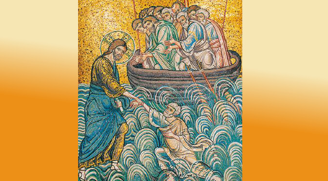 Depois de ter saciado a fome à multidão, Jesus obrigou os discípulos a subir para o barco e a esperá-l’O na outra margem, enquanto Ele despedia a multidão. Logo que a despediu, subiu a um monte, para orar a sós. Ao cair da tarde, estava ali sozinho. O barco ia já no meio do mar, açoitado pelas ondas, pois o vento era contrário. Na quarta vigília da noite, Jesus foi ter com eles, caminhando sobre o mar. Os discípulos, vendo-O a caminhar sobre o mar, assustaram-se, pensando que fosse um fantasma. E gritaram cheios de medo. Mas logo Jesus lhes dirigiu a palavra, dizendo: «Tende confiança. Sou Eu. Não temais». Respondeu-Lhe Pedro: «Se és Tu, Senhor, manda-me ir ter contigo sobre as águas». «Vem!» – disse Jesus. Então, Pedro desceu do barco e caminhou sobre as águas, para ir ter com Jesus. Mas, sentindo a violência do vento e começando a afundar-se, gritou: «Salva-me, Senhor!». Jesus estendeu-lhe logo a mão e segurou-o. Depois disse-lhe: «Homem de pouca fé, porque duvidaste?». Logo que subiram para o barco, o vento amainou. Então, os que estavam no barco prostraram-se diante de Jesus e disseram-Lhe: «Tu és verdadeiramente o Filho de Deus». Depois fizeram a travessia e vieram para terra em Genesaré. Os homens do lugar reconheceram Jesus e mandaram avisar toda aquela região. Trouxeram-Lhe todos os doentes e pediam que os deixasse tocar ao menos na orla do seu manto. E quantos lhe tocaram foram completamente curados.