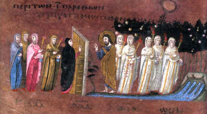 Naquele tempo, disse Jesus aos seus discípulos a seguinte parábola: «O reino dos Céus pode comparar-se a dez virgens, que, tomando as suas lâmpadas, foram ao encontro do esposo. Cinco eram insensatas e cinco eram prudentes. As insensatas, ao tomarem as suas lâmpadas, não levaram azeite consigo, enquanto as prudentes, com as lâmpadas, levaram azeite nas almotolias. Como o esposo se demorava, começaram todas a dormitar e adormeceram. No meio da noite ouviu-se um brado: ‘Aí vem o esposo; ide ao seu encontro’. Então, as virgens levantaram-se todas e começaram a preparar as lâmpadas. As insensatas disseram às prudentes: ‘Dai-nos do vosso azeite, que as nossas lâmpadas estão a apagar-se’. Mas as prudentes responderam: ‘Talvez não chegue para nós e para vós. Ide antes comprá-lo aos vendedores’. Mas, enquanto foram comprá-lo, chegou o esposo: as que estavam preparadas entraram com ele para o banquete nupcial; e a porta fechou-se. Mais tarde, chegaram também as outras virgens e disseram: ‘Senhor, senhor, abre-nos a porta’. Mas ele respondeu: ‘Em verdade vos digo: Não vos conheço’. Portanto, vigiai, porque não sabeis o dia nem a hora».