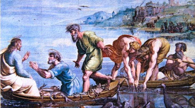 Naquele tempo, estava a multidão aglomerada em volta de Jesus, para ouvir a palavra de Deus. Ele encontrava-Se na margem do lago de Genesaré e viu dois barcos estacionados no lago. Os pescadores tinham deixado os barcos e estavam a lavar as redes. Jesus subiu para um barco, que era de Simão, e pediu-lhe que se afastasse um pouco da terra. Depois sentou-Se e do barco pôs-Se a ensinar a multidão. Quando acabou de falar, disse a Simão: «Faz-te ao largo e lançai as redes para a pesca». Respondeu-Lhe Simão: «Mestre, andámos na faina toda a noite e não apanhámos nada. Mas, já que o dizes, lançarei as redes». Eles assim fizeram e apanharam tão grande quantidade de peixes que as redes começavam a romper-se. Fizeram sinal aos companheiros que estavam no outro barco para os virem ajudar; eles vieram e encheram ambos os barcos de tal modo que quase se afundavam. Ao ver o sucedido, Simão Pedro lançou-se aos pés de Jesus e disse-Lhe: «Senhor, afasta-Te de mim, que sou um homem pecador». Na verdade, o temor tinha-se apoderado dele e de todos os seus companheiros, por causa da pesca realizada. Isto mesmo sucedeu a Tiago e a João, filhos de Zebedeu, que eram companheiros de Simão. Jesus disse a Simão: «Não temas. Daqui em diante serás pescador de homens». Tendo conduzido os barcos para terra, eles deixaram tudo e seguiram Jesus.