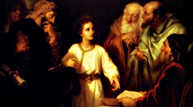 Os pais de Jesus iam todos os anos a Jerusalém, pela festa da Páscoa. Quando Ele fez doze anos, subiram até lá, como era costume nessa festa. Quando eles regressavam, passados os dias festivos, o Menino Jesus ficou em Jerusalém, sem que seus pais o soubessem. Julgando que Ele vinha na caravana, fizeram um dia de viagem e começaram a procurá-l’O entre os parentes e conhecidos. Não O encontrando, voltaram a Jerusalém, à sua procura. Passados três dias, encontraram-n’O no templo, sentado no meio dos doutores, a ouvi-los e a fazer-lhes perguntas. Todos aqueles que O ouviam estavam surpreendidos com a sua inteligência e as suas respostas. Quando viram Jesus, seus pais ficaram admirados; e sua Mãe disse-Lhe: «Filho, porque procedeste assim connosco? Teu pai e eu andávamos aflitos à tua procura». Jesus respondeu-lhes: «Porque Me procuráveis? Não sabíeis que Eu devia estar na casa de meu Pai?». Mas eles não entenderam as palavras que Jesus lhes disse. Jesus desceu então com eles para Nazaré e era-lhes submisso. Sua Mãe guardava todos estes acontecimentos em seu coração. E Jesus ia crescendo em sabedoria, em estatura e em graça, diante de Deus e dos homens.