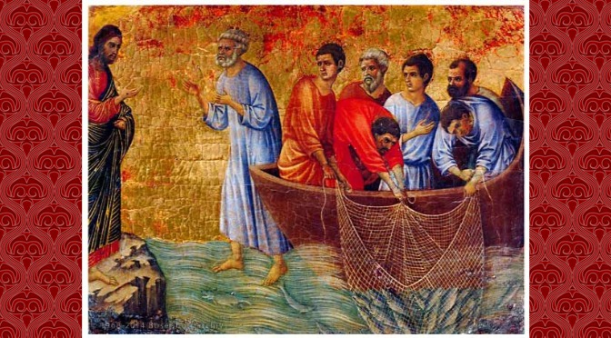 Naquele tempo, Jesus manifestou-Se novamente aos discípulos junto ao Mar de Tiberíades. Manifestou-Se deste modo: Estavam juntos Simão Pedro, Tomé, chamado Dídimo, e Natanael, que era de Caná da Galileia. Também estavam presentes os filhos de Zebedeu e mais dois discípulos de Jesus. Disse-lhes Simão Pedro: «Vou pescar». Eles responderam-lhe: «Nós vamos contigo». Saíram de casa e subiram para o barco, mas naquela noite não apanharam nada. Ao romper da manhã, Jesus apresentou-Se na margem, mas os discípulos não sabiam que era Ele. Disse-lhes então Jesus: «Rapazes, tendes alguma coisa para comer?» Eles responderam: «Não». Disse-lhes Jesus: «Lançai a rede para a direita do barco e encontrareis». Eles lançaram a rede e já mal a podiam arrastar por causa da abundância de peixes. Então o discípulo predilecto de Jesus disse a Pedro: «É o Senhor». Simão Pedro, quando ouviu dizer que era o Senhor, vestiu a túnica que tinha tirado e lançou-se ao mar. Os outros discípulos, que estavam distantes apenas uns duzentos côvados da margem, vieram no barco, puxando a rede com os peixes. Logo que saltaram em terra, viram brasas acesas com peixe em cima, e pão. Disse-lhes Jesus: «Trazei alguns dos peixes que apanhastes agora». Simão Pedro subiu ao barco e puxou a rede para terra, cheia de cento e cinquenta e três grandes peixes. E, apesar de serem tantos, não se rompeu a rede. Disse-lhes Jesus: «Vinde comer». Nenhum dos discípulos se atrevia a perguntar: «Quem és Tu?»: bem sabiam que era o Senhor. Então Jesus aproximou-Se, tomou o pão e deu-lho, fazendo o mesmo com o peixe. Foi esta a terceira vez que Jesus Se manifestou aos discípulos, depois de ter ressuscitado dos mortos.