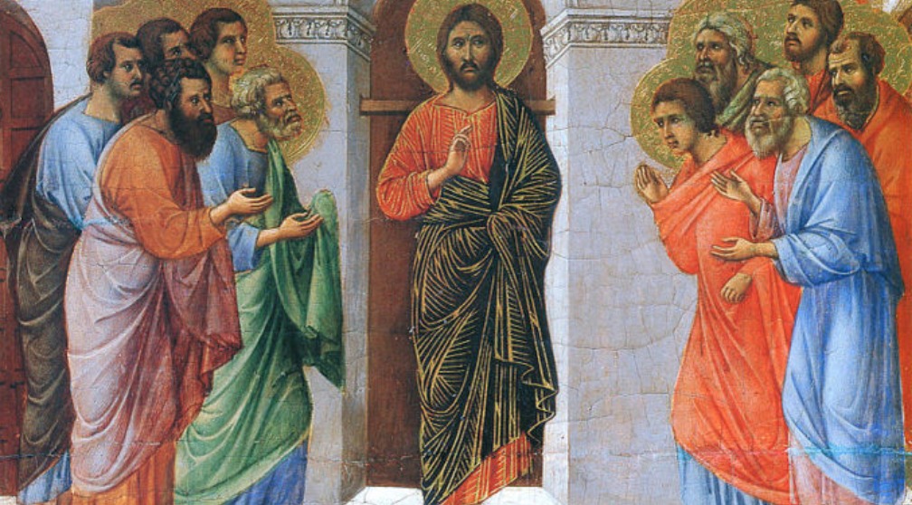 Na tarde daquele dia, o primeiro da semana, estando fechadas as portas da casa onde os discípulos se encontravam, com medo dos judeus, veio Jesus, apresentou-Se no meio deles e disse-lhes: «A paz esteja convosco». Dito isto, mostrou-lhes as mãos e o lado. Os discípulos ficaram cheios de alegria ao verem o Senhor. Jesus disse-lhes de novo: «A paz esteja convosco. Assim como o Pai Me enviou, também Eu vos envio a vós». Dito isto, soprou sobre eles e disse-lhes: «Recebei o Espírito Santo: àqueles a quem perdoardes os pecados ser-lhes-ão perdoados; e àqueles a quem os retiverdes ser-lhes-ão retidos».