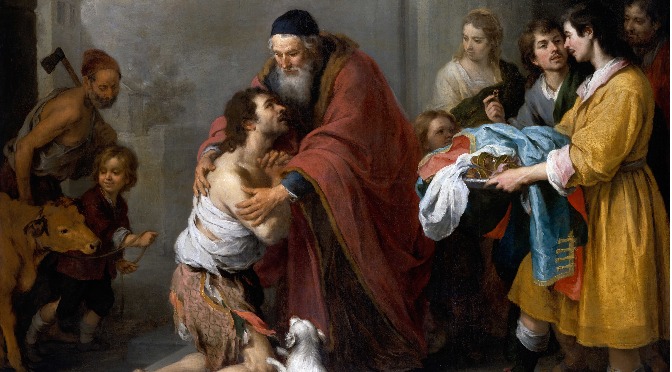Naquele tempo, os publicanos e os pecadores aproximavam-se todos de Jesus, para O ouvirem. Mas os fariseus e os escribas murmuravam entre si, dizendo: «Este homem acolhe os pecadores e come com eles». Jesus disse-lhes então a seguinte parábola: «Um homem tinha dois filhos. O mais novo disse ao pai: ‘Pai, dá-me a parte da herança que me toca’. O pai repartiu os bens pelos filhos. Alguns dias depois, o filho mais novo, juntando todos os seus haveres, partiu para um país distante e por lá esbanjou quanto possuía, numa vida dissoluta. Tendo gasto tudo, houve uma grande fome naquela região e ele começou a passar privações. Entrou então ao serviço de um dos habitantes daquela terra, que o mandou para os seus campos guardar porcos. Bem desejava ele matar a fome com as alfarrobas que os porcos comiam, mas ninguém lhas dava. Então, caindo em si, disse: ‘Quantos trabalhadores de meu pai têm pão em abundância, e eu aqui a morrer de fome! Vou-me embora, vou ter com meu pai e dizer-lhe: Pai, pequei contra o Céu e contra ti. Já não mereço ser chamado teu filho, mas trata-me como um dos teus trabalhadores’. Pôs-se a caminho e foi ter com o pai. Ainda ele estava longe, quando o pai o viu: encheu-se de compaixão e correu a lançar-se-lhe ao pescoço, cobrindo-o de beijos. Disse-lhe o filho: ‘Pai, pequei contra o Céu e contra ti. Já não mereço ser chamado teu filho’. Mas o pai disse aos servos: ‘Trazei depressa a melhor túnica e vesti-lha. Ponde-lhe um anel no dedo e sandálias nos pés. Trazei o vitelo gordo e matai-o. Comamos e festejemos, porque este meu filho estava morto e voltou à vida, estava perdido e foi reencontrado’. E começou a festa. Ora o filho mais velho estava no campo. Quando regressou, ao aproximar-se da casa, ouviu a música e as danças. Chamou um dos servos e perguntou-lhe o que era aquilo. O servo respondeu-lhe: ‘O teu irmão voltou e teu pai mandou matar o vitelo gordo, porque ele chegou são e salvo’. Ele ficou ressentido e não queria entrar. Então o pai veio cá fora instar com ele. Mas ele respondeu ao pai: ‘Há tantos anos que eu te sirvo, sem nunca transgredir uma ordem tua, e nunca me deste um cabrito para fazer uma festa com os meus amigos. E agora, quando chegou esse teu filho, que consumiu os teus bens com mulheres de má vida, mataste-lhe o vitelo gordo’. Disse-lhe o pai: ‘Filho, tu estás sempre comigo e tudo o que é meu é teu. Mas tínhamos de fazer uma festa e alegrar-nos, porque este teu irmão estava morto e voltou à vida, estava perdido e foi reencontrado’».