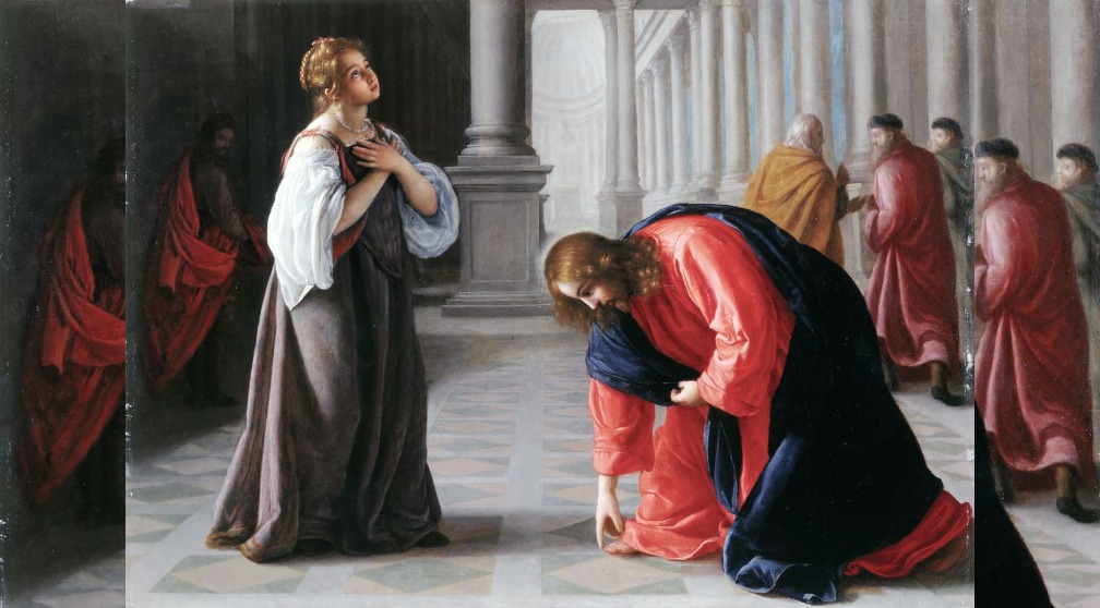 Naquele tempo, Jesus foi para o monte das Oliveiras. Mas de manhã cedo, apareceu outra vez no templo e todo o povo se aproximou d’Ele. Então sentou-Se e começou a ensinar. Os escribas e os fariseus apresentaram a Jesus uma mulher surpreendida em adultério, colocaram-na no meio dos presentes e disseram a Jesus: «Mestre, esta mulher foi surpreendida em flagrante adultério. Na Lei, Moisés mandou-nos apedrejar tais mulheres. Tu que dizes?». Falavam assim para Lhe armarem uma cilada e terem pretexto para O acusar. Mas Jesus inclinou-Se e começou a escrever com o dedo no chão. Como persistiam em interrogá-l’O, ergueu-Se e disse-lhes: «Quem de entre vós estiver sem pecado atire a primeira pedra». Inclinou-Se novamente e continuou a escrever no chão. Eles, porém, quando ouviram tais palavras, foram saindo um após outro, a começar pelos mais velhos, e ficou só Jesus e a mulher, que estava no meio. Jesus ergueu-Se e disse-lhe: «Mulher, onde estão eles? Ninguém te condenou?». Ela respondeu: «Ninguém, Senhor». Disse então Jesus: «Nem Eu te condeno. Vai e não tornes a pecar».