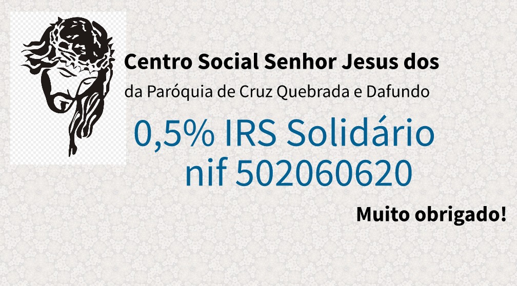 Pedimos, assim, que quando entregar a declaração de IRS referente aos rendimentos de 2021, se recorde de que pode consignar 0,5% deste valor, de forma simples e gratuita, para o Centro Social Senhor Jesus dos Aflitos da Paróquia da Cruz Quebrada e Dafundo. Estes 0,5% do seu IRS ajudam-nos a ajudar pessoas mais vulneráveis. É um gesto que não comporta qualquer custo e faz toda a diferença no apoio a quem mais precisa. Ao preencher a sua declaração introduza o NIF 502060620. Assim estará a apoiar a nossa Missão. Desde já o nosso muito obrigado!