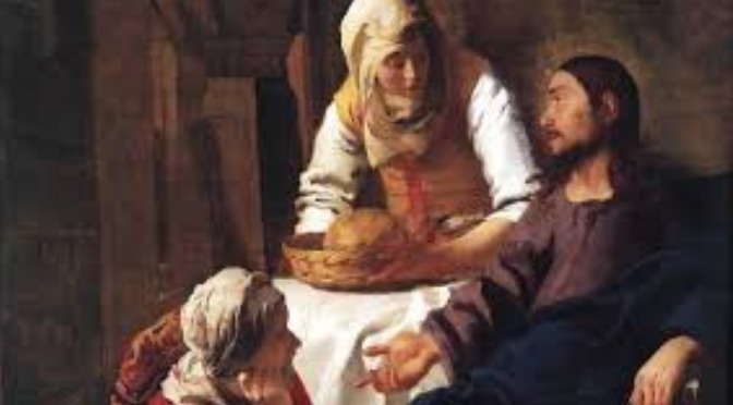 Naquele tempo, Jesus entrou em certa povoação e uma mulher chamada Marta recebeu-O em sua casa. Ela tinha uma irmã chamada Maria, que, sentada aos pés de Jesus, ouvia a sua palavra. Entretanto, Marta atarefava-se com muito serviço. Interveio então e disse: «Senhor, não Te importas que minha irmã me deixe sozinha a servir? Diz-lhe que venha ajudar-me». O Senhor respondeu-lhe: «Marta, Marta, andas inquieta e preocupada com muitas coisas, quando uma só é necessária. Maria escolheu a melhor parte, que não lhe será tirada».