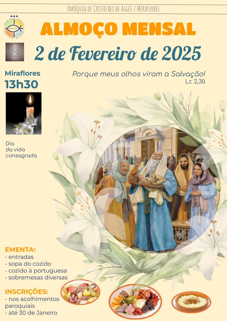 No dia 2 de Fevereiro, Festa da Apresentação do Senhor e dia da Vida Consagrada, realiza-se o almoço mensal de primeiro Domingo, desta vez com o renomado cozido à portuguesa.