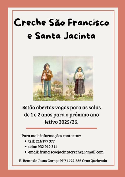 A Creche S. Francisco e Sta. Jacinta, vinculada ao Centro Social Senhor Jesus dos Aflitos da Igreja da Cruz Quebrada, recebem inscrições de crianças, de 01 e de 02 anos de idade, para novas vagas abertas relativamente ao período de 2025/2026.