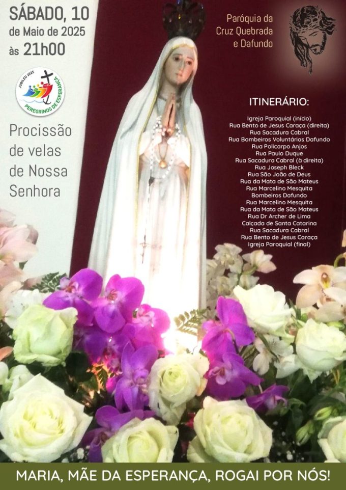 No dia 10 de maio, às 21h, a Comunidade da Cruz Quebrada-Dafundo está convidada a participar da Procissão de Velas de Nossa Senhora, com início do cortejo na Igreja Paroquial e a seguir pelas ruas próximas à igreja.