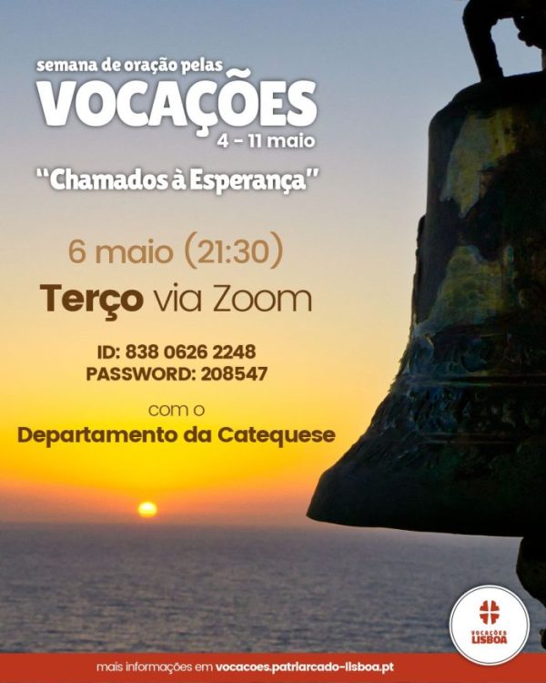 O Setor de Animação Vocacional do Patriarcado de Lisboa divulga a Semana de Oração pelas Vocações, entre os dias 04 a 11 de maio, com o tema: “Chamados à Esperança”. E tal como em anos anteriores, ao longo da semana, a Diocese é convidada a rezar o terço via zoom tendo em cada dia uma intenção vocacional.
